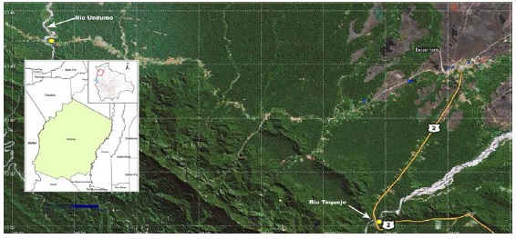 Imagen satelital de la localidad de Ixiamas y sus alrededores, donde se observan los puntos de muestreo, incluidos los puntos del Río Tequeje y del Río Undumo
