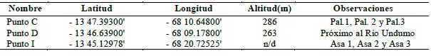 La ubicación de los diferentes puntos donde se tomaron y recolectaron las muestras del fruto y palmito se encuentran en la Tabla 1, también se pueden observar los diferentes puntos en imagen satelital (Fig.1). Las imágenes fueron elaboradas por GPS-Bolivia
