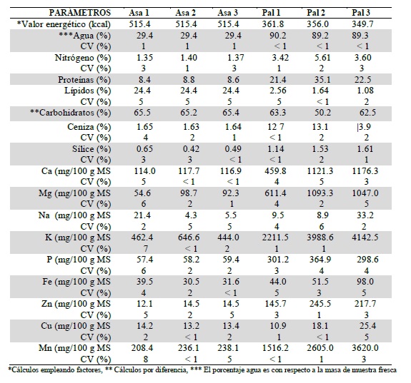 Manganeso: Los contenidos varían de 208.4 a 238.1 mg/kg MS y en palmito oscila de 1516.2 a 3620.0 mg/kg MS