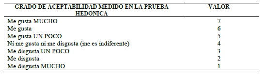 Los resultados de la prueba hedónica que indican el grado de aceptabilidad o rechazo, representan a los valores obtenidos según la tabla utilizada que se presenta a continuación: