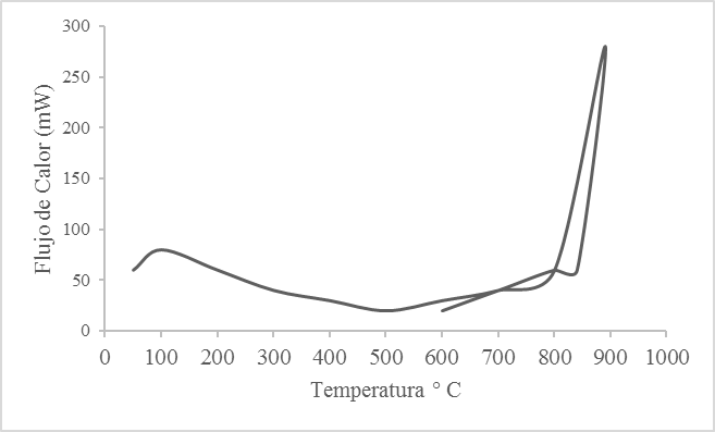 De acuerdo al análisis calorimétrico mostrado en la Figura 3 se puede observar una ligera banda endotérmica a 60 °C, y un intenso pico de absorción térmica a 890 °C. Este último, representa una temperatura de cambio estructural y de las características en el material, según Matienzo J.G. [16]. De acuerdo a este autor, la concha de abanico se debe calcinar a 890°C por 4 horas (Ver fig. 3).