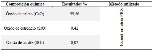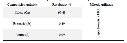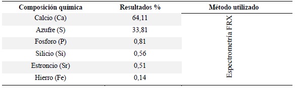 El análisis de la composición elemental de las muestras de yeso y residuos de conchas de abanico se realizó de manera separada mediante la técnica de Fluorescencia de Rayos X (FRX) SHIMADZU, EDX 800 HS con tubo de rayos X Target de Rh, voltaje de 4 a 50 kV, corriente de tubo de 1 a 1000 mA, detector semiconductor de silicio SDD (no requiere nitrógeno líquido). Se obtuvieron los resultados del yeso y de la concha de abanico calcinada en función de su química elemental y química expresada en óxidos.