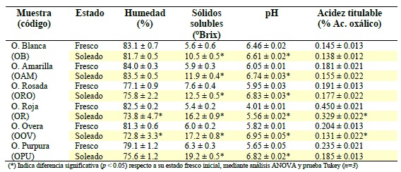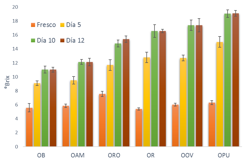 Respecto a los valores de humedad, las muestras frescas OAM y OB presentaron mayor humedad con un 84.0% y 83.1% respectivamente, pero estas poseían menor concentración de sólidos solubles, mientras tanto que las muestras con menor contenido de humedad fueron ORO y OPU con 77.1%, y 79.1% respectivamente, mostrando mayor concentración de sólidos solubles. En el caso de los valores de pH OR fue la que presentó menor pH inicial y por lo tanto mayor acidez titulable.