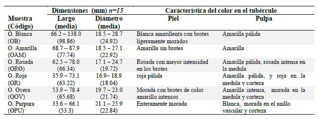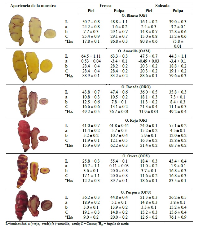 La Oca Blanca (OB) posee una ligera coloración violácea en la parte de los brotes (comúnmente conocido como “ojos”), la piel y la pulpa son de color blanco. La oca amarilla (OAM) con una distribución unicolor tanto para la superficie de la piel y su pulpa de color amarillo, ambos poseen forma claviforme. La oca rosada (ORO), la oca roja (OR) y la oca overa (OOV) poseen una forma alargada. ORO con un color primario amarillo pálido y color secundario rosado el cual está distribuido irregularmente en la piel, pero con más intensidad en la región de los brotes y la medula. OR externamente posee un color rojo, pero en la pulpa está dividido por un color amarillo pálido como primario y rosado en el anillo vascular y la corteza. OOV dominado con un color purpura en la piel con ligera coloración amarilla alrededor de los brotes, en la pulpa están presenten los mismos colores observando que su medula y corteza poseen el color purpura. Finalmente oca purpura (OPU) que posee una forma ovoide, se caracteriza por su color morado uniforme en su piel pero con mayor intensidad alrededor de los brotes, mientras que la pulpa está distribuida por un color amarillo y purpura distribuido en el anillo vascular. Los colores fueron estimados a simple vista, pero estas muestras también se analizaron por colorimetría que se puede observar en la tabla 2.