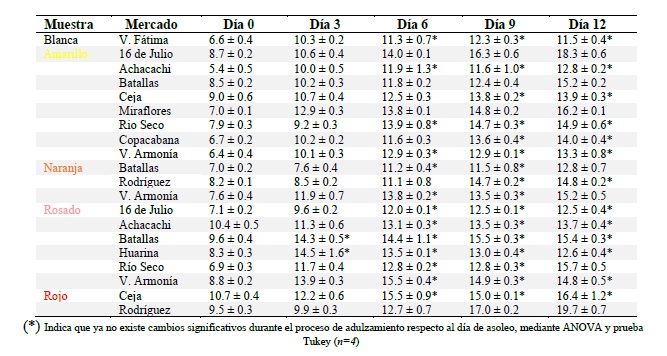 (*) Indica que ya no existe cambios significativos durante el proceso de adulzamiento respecto al día de asoleo, mediante ANOVA y prueba Tukey (n=4)