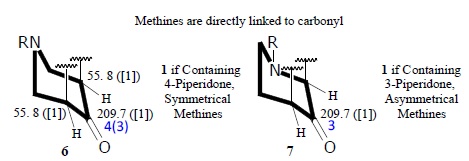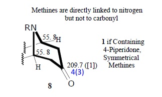 Finally in table B5 [9] we find (C)2CH-N in the range 60-40 ppm, it means a methine linked to two carbons and one nitrogen. Since we have established peak 2 as methine and that its high intensity suggests two chemically equivalent carbons (same d, symmetrically disposed), we are assigning to peak 2 two carbons, mirror images from each other, each in one of two identical moieties of the molecule. Having been discarded 7 (3-piperidone in 1), 8 shows the remaining 4-piperidone when methines are directly linked to N but not to carbonyl. Of course, these latter are symmetrically disposed.
