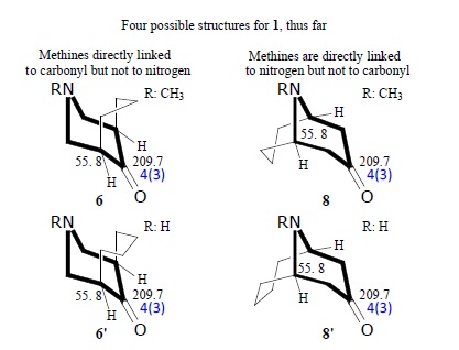 Since in this discussion we placed firstly methines in a of carbonyl (HC-C=O, 6, 6’), then the symmetrical methylene groups are placed in b of carbonyl of 4-piperidone. If we place methines in b of carbonyl, then methylene groups are in a of carbonyl (H2C-C=O, 8, 8’). Summarizing, depending of the position of the fourth carbon from the 4 remaining after assignment of the first five to 4-piperidone, we have four possible structures for 1, 6, 6’, 8 and 8’. We can at this point reassure the apparition of the second ring of bicyclic 1.