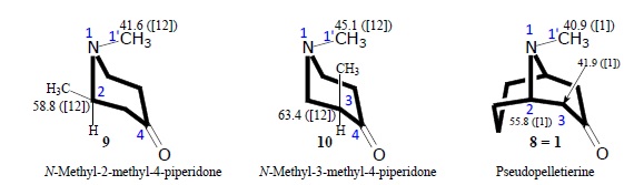 Peak 4. Peak 3 and peak4 in the APT 13C spectrum (Fig.1) are downwards, and upwards, meaning thus a methylene and a methyl group, respectively. The alternative of a methine for peak 4 is discarded from the summing of the number of protons, thus far, it means that in any of the 4 possible structures for 1, 6, 6’, 8 and 8’, we count 15 protons, in accordance with the molecular formula C9H15NO. 6 and 8 show the N-methyl-4-piperidone nucleus (containing the N-CH3 group). It’s unconceivable to propose a N-CH group. On the other hand, 6’ and 8’ show the 4-piperidone nucleus (containing the N-H group). Hence, the counting of protons in 6 and 8 is as follows: 5CH2 + 2CH + 1CH3N= C8H15N. The counting of protons in 6’ and 8’ is 6CH2 + 2CH + NH = C8H15N. In all four alternative structures for 1 (6, 6’, 8 and 8’) the maximum number of methines (CH) is 2 (already assigned to peak 2), consequently, peak 4 is not a methine but a methyl group pertaining to the 9 carbon atoms in the molecular formula, where 5 belong to the nucleus 4-piperidone of 1. The chemical shift value of N-CH3 in 1 is d 40.9 (Table 1) that compared with the d 45.9 of methyl in N-methyl-4-piperidine (Table C177 [9]) presents a small difference of 5 ppm, interpreted by us as a proven assignment of the group N-CH3 in 1. Moreover, we found a bibliographic source [12] that gives 13C data for N-methyl-4-piperidones. In Table I [12], the N-CH3 carbon receives the value d 41.6 (C-1’), in structure V (N-methyl-2-methyl-4-piperidone, see compound 9 here), very close to d 40.9 in 1 (Dd = 0.7 ppm). In that very same compound (V, 9) carbon 2 (in alpha of amine) shows a d 58.8 comparable to 55.8 ppm of C-2 in 1 (Dd = 3.0 ppm). On the other hand, the same source shows structure VIa or N-methyl-3-methyl-4-piperidone, see compound 10 here), for which C-3 has a value d 63.4, much different from d 55.8 in 1 (Dd = 7.6 ppm), and C-1’ with d 45.1 much different from C-1’ in 1 (40.9, Dd = 4.2 ppm), and finally very different from C-3 in 1 (41.9, Dd = 21.5 ppm). In conclusion, these data from source [12] permitted us to define the position of the methines of junction of rings, of the portion N-methyl-4-piperidone of 1 as C-2 (or positioned in a of amine, and not on a of carbonyl), this under the optics that substituent in C-2 is an alkyl group, and that the CH3 group in 9 is magnetically comparable to the group -CH2-CH2- in 1. Since we have defined the location of the only methyl group as N-CH3 and that the two methines, rings’ junction carbons (C-2 of N-methyl-4-piperidone of 1) are placed in a of amine and not in a of carbonyl, then, we can discard structures 6, 6’ and 8’. This puts structure 8 as the final structure of 1.
