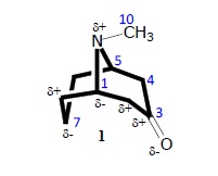 From 8, we know that the structural complement of the N-methyl-piperidone moiety, or ring A of 1 is the fused ring B composed by the bridge atoms 1, 5 and 9, and complemented by atoms 6, 7 and 8. Here, C-6 and C-8, and C.-1 and C-5 are symmetrical (mirror images). The symmetrical methines C-1 and C-5 were already worked. 9 is nitrogen. Then in ring B, symmetrical C-6 and C-8 have one same 13C signal (a first of three CH2 groups in Fig. 1). The second signal methylene corresponds to C-7. The third peak downwards must correspond to two equivalent methylene groups not described yet, namely C-2 and C-4 in ring A. A priori, it is easy to assign the three peaks, 3, 5 and 6, on the basis of the d value of each. It is obvious that the most shielded nucleus is C-7 (peak 6, 15.8 ppm), this due to the extreme farness from highly electronegative atoms, it is worth to say, N and C=O. Somehow more de-shielded is peak 5 (29.1 ppm), this can be assigned the couple C-6/C-8. This because of its closeness to nitrogen, being placed in b of N. By default, and due to its placement between two strong de-shielding factors, the carbonyl and the amine groups, the couple C-2/C-4, is assigned to peak 3 (41.9 ppm). This couple is placed in a of C=O and in b of N. Nevertheless, to be orthodox, we need to check this premature conclusions by examining tabled data. Peak 3 (41.9 ppm) is according to Table B5 [9] (60-40 ppm range) a methylene between 2 carbons (a corroborating fact, since C-2/C-4 are between C-3 and C-1/C-5). Secondly, Table B5 shows a methylene directly bonded to nitrogen, (let’s say in a of N). Thirdly, these symmetrical methylene groups can be placed in a of C=O (Table B5 [9]). There is no contradiction in these three assignments grosso modo. Moreover, Table C190 [9], shows methylene in a of C=O of cyclohexanone with d 41.5 ppm (Dd = 0.4 ppm). To be more precise, reference [12] shows compound IV, N-methyl-piperidone, with d 40.9 for the couple of methylenes C-3/C-5. Peak 5 (29.1 ppm), this d value falls into the range 40-20 ppm in Table B5 [9] that firstly shows a methylene directly bonded to two other carbons, it is just the case for C-6/C-8 in ring B of 1 (between methines 1/5 and methylene C-7), there are no more data in this table (B5 [9]). Table C177 [9] shows C-3 at d 26.4 in N-methylpiperidine (Dd = 2.7 ppm) corroborating the a priori assignment. Peak 6 (15.8 ppm) falls in the range 20-0 ppm in Table B5 [9], corresponding to aliphatic methylene (between C-6 and C-8). Table C177 [9] shows C-4 at d 26.4 in N-methylpiperidine, this value is not close to 15.8 ppm of C-7 in 1. We found a reference [13], where different measurements on cyclooctanone-1,2-D2 were performed, giving values like 25.18, 24.88, 24.78 and 24.76 ppm for C-5 of cyclooctanone. These two values, C-4 (N-methylpiperidine) and C-5 (cyclooctanone) are more alike between them than with C-7 (15.8 ppm) in 1. Thus, in order to propose an explanation for the value 15.8 ppm of the highly shielded C-7 of 1, we deduce that the combination of N-methylpiperidine and cyclooctanone made possible such shielding on C-7 of 1. The following graphic proposing partial electronic densities generated by carbonyl as a kind of driving force could justify an electronic accumulation over the C-7 nucleus of 1. In this graphic the driving force exerted by carbonyl would be superior to that exerted by nitrogen, in spite of the through-the-bonds distance. The value of d 20.8 (C-7) in 1, was reported in [1] as a 13C-NMR signal predicted by ChemBio-Draw®.