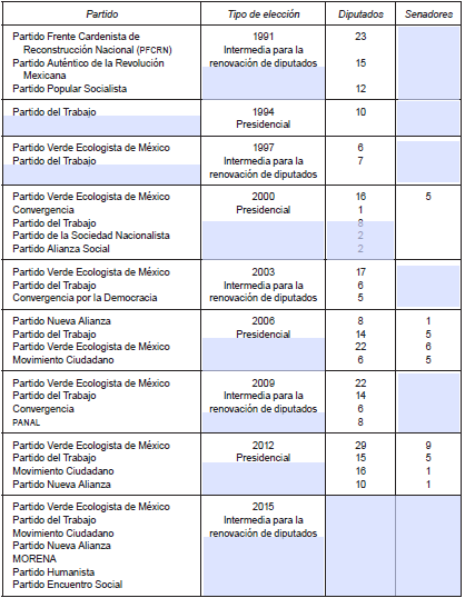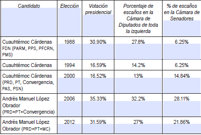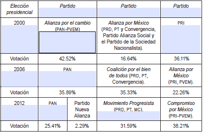 Hasta el 2012, en México sólo dos partidos se han rotado en la presidencia de la República. El pri gobernó desde su creación, en 1946, hasta el año 2000 y el pan lo hizo en dos sexenios consecutivos: de 2000 a 2006 y de 2006 a 2012. La izquierda, representada por el prd, quedó en segundo lugar tanto en 2006 como en 2012. Visto así, ningún partido ha tenido la posibilidad de desplazar a los tres grandes. Desde el año 2000, la rentabilidad de los partidos pequeños derivó de establecer alianzas electorales con pri, prd o pan (Cuadro 1).