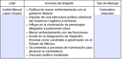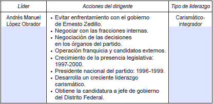 El tipo de liderazgo desarrollado por López Obrador durante este periodo se expresa en evitar enfrentamientos con el gobierno de Ernesto Zedillo, negociar con las fracciones perredistas, acordar las decisiones en los órganos del partido; poner en marcha la "operación franquicia" e incluir a candidatos externos (Cuadro 2). En el ejercicio de la presidencia nacional del prd (1996-1999), aumentó la presencia legislativa de este partido (1997-2000). El crecimiento de su liderazgo le permitió obtener la candidatura a Jefe de Gobierno del Distrito Federal.