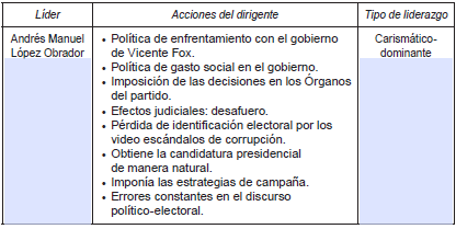 3. Durante los años que van de 2000 a 2005, el liderazgo de López Obrador se fortaleció notablemente. Estaba en proceso la recomposición del prd, bajo la forma de redefinición ideológica. Durante la realización del vi Congreso Nacional perredista, después de su tercera derrota presidencial, Cárdenas señaló que "la izquierda no debe ser más un asunto de definiciones, sino definirse en función de contenidos" (Bolivar, 2004: 209); ello que significaba mantener vigente la vieja postura oposicionista. Por su parte, el jefe de gobierno del df acrecentaba su simpatía apuntalada por el posicionamiento mediático y por los programas asistencialistas y los de infraestructura. Al mismo tiempo, el proceso de desafuero, los video-escándalos que mostraban actos de corrupción y el enfrentamiento constante con el presidente Vicente Fox, afectaban su imagen (Valdés, 2004), pero no su creciente influencia. La contienda electoral de 2006 fue una de las más cerradas en la historia electoral de México. López Obrador, candidato presidencial del prd, quedó en segundo lugar con 35.33% de los votos, sólo a medio punto porcentual de Felipe Calderón, del pan, quien ganó con 35.89% (Modonesi, 2008: 39). Los resultados fueron validados por el Tribunal Electoral del Poder Judicial de la Federación (tepjf). La resolución no fue aceptada por López Obrador y seguidores, e iniciaron una etapa de movilizaciones para cuestionar el resultado. En el período 2000-2006 cambiaron las características generales del tipo de liderazgo del perredista. La política de enfrentamiento con el gobierno de Vicente Fox se hizo acompañar de una ampliación considerable del gasto social del gobierno del df y del control de las decisiones del partido. Junto a los efectos judiciales provocados por el proceso de desafuero, se produce el escándalo por los videos que muestran a funcionarios suyos en actos de corrupción, intentos fallidos para acabar con las pretensiones políticas del Jefe de Gobierno del df. Muy fortalecido por su exitosa defensa, obtuvo la candidatura presidencial sin competidor dentro del prd, donde se impone como el gran tomador de las decisiones y quien define la estrategia de campaña, personalización que lo va a conducir a errores aprovechados por sus adversarios (Cuadro 3).