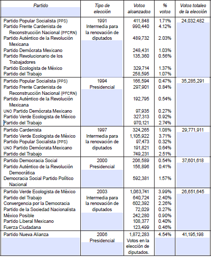 2. El pluralismo moderado, por excluyente, no ha alentado el fortalecimiento de nuevos partidos. Desde 1989 hasta el 2012, ningún partido, fuera de los tres grandes, superó el 6.5% de votos. En 1994, un partido pequeño, el Partido del Trabajo (pt), obtuvo el 2.74%; los demás no superaron el 1%: el Partido Popular Socialista (pps) obtuvo el 0.47%, el Partido Frente Cardenista de Reconstrucción Nacional (pfcrn) el 0.84%, el Partido Demócrata Mexicano (pdm) el 0.27% y el pvem el 0.92%.6 Los candidatos presidenciales fuertes y conocidos fueron: Ernesto Zedillo del pri, Diego Fernández del pan y Cuauhtémoc Cárdenas del prd. Los otros partidos postularon a candidatos poco atractivos para el electorado, por lo que lograron una limitada captación de votos. A pesar de que las elecciones del 6 de junio de 2015 no incluyeron la renovación de la Presidencia de la República, y sin ser candidato a cargo alguno, López Obrador abanderó la difusión de morena a lo largo y ancho de la República. Él fue la figura central de los spots transmitidos en televisión: "Vente con nosotros a morena . morena es la esperanza de México",7 era uno de sus mensajes. Los partidos pequeños presentes en la contienda electoral de 1994 y posteriores carecían de un liderazgo parecido. En el 2000, el partido pequeño que alcanzó el mayor nivel de votación fue Democracia Social (pds) con el 1.57% de los votos, pero no consiguió mantener su registro, pues el umbral de votación era de 2%. Junto con el pds, también desaparecieron el Partido del Centro Democrático (pcd), que obtuvo solamente el 0.54% y el Partido Auténtico de la Revolución Mexicana (parm), con el 0.41% de la votación.8 En 2003, México Posible únicamente alcanzó 0.90% de la votación, el Partido de la Sociedad Nacionalista, 0.27%; el Partido Liberal Mexicano, 0.40%; Fuerza Ciudadana, 0.46%, y el Partido Alianza Social, 0.74%; imposibilitados, como estuvieron, para alcanzar el umbral del 2%, todos ellos perdieron el registro.9 El electorado se mantuvo fiel a los partidos más conocidos (Moreno, 2003; Moreno y Méndez, 2007) y ninguna de esas nuevas ofertas contó con un líder carismático fuerte o con una estructura sólida. En 2006, dos nuevos partido entraron en la competencia: el Partido Nueva Alianza (pana l) y el Partido Alternativa Socialdemócrata y Campesina. Esta vez, ambos mantuvieron su registro al rebasar el umbral mínimo de votos: el panal obtuvo el 4.54% en la elección de Diputados y Alternativa alcanzó el 2.71% en la elección presidencial,10 resultado novedoso en ambos casos, pero alejado de la barrera del 6.5%. Alternativa abandonó la competencia muy pronto, en 2009. Como en elecciones anteriores, pri, pan y prd mantuvieron la fidelidad de su núcleo básico. En 2012, de los partidos pequeños, el único que compitió fuera de las coaliciones fue el pana l, que obtuvo el 2.28%11 de los votos; de los grandes, fue el pan, con su candidata Josefina Vázquez Mota. El pri y el prd lo hicieron en coaliciones: la Coalición Compromiso por México (pri+pvem) postuló a Enrique Peña Nieto; Movimiento Progresista (prd+pt+mc) nominó a López Obrador. De 1988 a 2012 se fundaron varios nuevos partidos, la mayoría de los cuales ha desaparecido, mientras que los que sobrevivieron no han consolidado su identidad o mantienen un núcleo limitado de simpatizantes (Anexo 1) y de legisladores (Anexo 2). De los que mantuvieron su vigencia, el pt nació en 1990, el pvem en 1991, Convergencia por la Democracia en 1999, pero cambió de nombre a Movimiento Ciudadano (mc) en 2011, y en 2012 emergió el panal, cuyo padrinazgo se atribuye a la profesora Elba Esther Gordillo, entonces lideresa del snte.