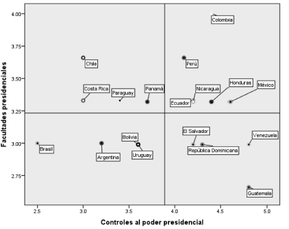 Como se indicó, el propósito de este trabajo fue el de señalar la concentración y/o la dispersión del poder presidencial en América Latina a partir del análisis de una serie de indicadores presentes en los textos constitucionales de la región. Una vez analizados los controles y los poderes de cada presidente, un cruce entre ambas variables nos permite delimitar un panorama como el que se presenta a continuación: