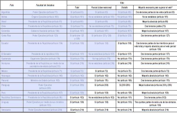 Como puede observarse en el Cuadro 1, todos los presidentes de la región latinoamericana cuentan con la facultad de iniciativa. En esta materia existen dos variantes: 1. en casi todos los casos esta prerrogativa recae exclusivamente en el presidente; 2. en otros casos, los ministros o los secretarios de Estado están igualmente facultados para presentar los proyectos de ley (Honduras, Panamá y Paraguay), aunque siempre a nombre del Ejecutivo. Una de las facultades más importantes que poseen los presidentes latinoamericanos es la capacidad para vetar las disposiciones aprobadas por el Poder Legislativo. Todas las constituciones de la región le confieren a los mandatarios dicho poder, la diferencia radica en los alcances del veto; es decir, puede ser total, parcial y/o de bolsillo. Los casos donde hay veto total son Bolivia, Guatemala y República Dominicana, mientras que los países que combinan el veto total y el parcial son México, Nicaragua, Panamá, Uruguay y Venezuela. A su vez, el veto total y de bolsillo lo tienen Chile, El Salvador y Honduras. De igual manera, existen casos en donde el titular del Ejecutivo está facultado para utilizar los tres tipos de veto, como son los casos de Argentina, Brasil, Colombia, Costa Rica, Ecuador y Paraguay. La constante en todos los países es el poder de vetar de forma total las leyes expedidas por el Congreso; la diferencia radica en que en algunos países el presidente puede vetar toda la ley, una parte de ésta, o simplemente retrasar su promulgación y, con ello, congelarla cuando esté en desacuerdo con la nueva legislación. Otra diferencia importante es la regla que se exige para superar el veto presidencial. En la mayoría de las constituciones, se requiere de una mayoría calificada, esto es, dos terceras partes de los miembros presentes de las Cámaras. No obstante, hay países que solicitan simplemente una mayoría absoluta (50+1), como son los casos de Brasil, Colombia, Nicaragua, Paraguay, Perú y Venezuela. Dos países establecen procedimientos especiales: en Ecuador se determina como requisito una mayoría calificada para superar el veto total y una mayoría absoluta para el veto parcial; mientras que la constitución de Uruguay establece tres quintas partes de los miembros de ambas Cámaras. Esto implica que en todos los casos, las legislaturas latinoamericanas cuentan con este instrumento para superar un posible veto del Ejecutivo. En cuanto a la facultad de decreto, los poderes de emergencia y la delegación legislativa, se trata de prerrogativas en donde no hay una interferencia del Legislativo para que el mandatario pueda tomar decisiones en ciertas áreas. El Cuadro 2 da cuenta de los poderes de los presidentes de América Latina en estos rubros. Por principio, en ocho países sus constituciones no especifican si el titular del Ejecutivo puede emitir decretos presidenciales (Costa Rica, El Salvador, Ecuador, Guatemala, México, Panamá, Paraguay y Uruguay). Esta ambigüedad ha llevado a que en la gran mayoría de los casos, este instrumento sea una práctica común que no contradice la constitución. Los diez países restantes (Argentina, Bolivia, Brasil, Chile, Colombia, Honduras, Nicaragua, Perú, República Dominicana y Venezuela) permiten los decretos presidenciales, y de ellos, cinco ponen restricciones sobre los temas en donde el Ejecutivo puede utilizar esta prerrogativa, como son los casos de Brasil, Honduras, Nicaragua, Perú y Venezuela. Cabe subrayar que los mandatarios de Argentina, Brasil, Chile y Colombia pueden utilizarlo en cualquier materia. En los países centroamericanos y algunos del cono sur como Paraguay, Uruguay y Venezuela, no se especifica en sus constituciones el establecimiento de límites a estas facultades, de aquí que estos presidentes no se encuentran impedidos para hacer uso de esta prerrogativa. En segundo lugar, puede observarse que todos los mandatarios de la región cuentan con poderes de emergencia para atender situaciones especiales o extraordinarias. Tales situaciones van desde catástrofes naturales, hasta problemas bélicos o revueltas sociales que puedan poner en riesgo la paz interna. Salvo Argentina, en los demás países no existen restricciones para utilizar este poder. En tercer lugar, la delegación legislativa es la facultad menos adoptada en la región, apenas siete países la contemplan (Argentina, Brasil, Chile, Colombia, México, Panamá y Perú), y de éstos, Chile, Colombia y México, han establecido restricciones sobre los tiempos y materias en que se pueden delegar facultades legislativas al Presidente. En lo que se refiere a los poderes presidenciales para convocar a la ciudadanía a referéndums o consultas, se trata de una prerrogativa que si bien no recae exclusivamente en el titular del Ejecutivo, en los últimos años se ha utilizado con mayor frecuencia en la región latinoamericana, siendo precisamente el Presidente quien ha emplazado en varias ocasiones a este ejercicio de democracia directa. Este mecanismo generalmente se utiliza cuando el Congreso ha rechazado una propuesta del mandatario. En estos casos, el Presidente apela a la ciudadanía para consultarle un tema en donde existe un desacuerdo en lo fundamental entre ambos poderes, de aquí que somete a consideración de los ciudadanos el tema para que se pronuncien en uno u otro sentido. Se trata de un recurso que puede utilizar el Ejecutivo cuando prevalece un desacuerdo entre la clase política sobre el contenido de una legislación. El objetivo es que la propuesta del Presidente tenga el apoyo de la mayoría de los ciudadanos. Cabe señalar que una vez que se ha promovido una consulta popular, algunas constituciones latinoamericanas le confieren al Poder Judicial la facultad de decidir si un tema puede ser sometido a referéndum. El siguiente cuadro muestra los países donde la constitución le confiere al titular del Ejecutivo o a cualquier otra institución la posibilidad de convocar a una cons