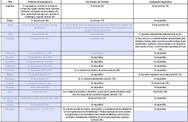 Para reconocer los niveles de concentración o dispersión de los poderes presidenciales en la región latinoamericana, primero es necesario identificar el conjunto de sus prerrogativas constitucionales. En términos generales, los poderes del Ejecutivo pueden dividirse en siete tipos: 1. en materia de defensa y de seguridad; 2legislativas, 3jurisdiccionales, 4en materia de política exterior, 5. de nombramiento, 6. económicas y 7. de emergencia. Las facultades de bolsa,4 la delegación legislativa,5 el poder de convocatoria a referéndum6 y los poderes de emergencia.7 De acuerdo a Scott Mainwaring y Matthew Shugart, cuando un mandatario concentra poderes de decreto, de iniciativa exclusiva y preferente y, además, tiene la facultad de convocar al Congreso a sesiones extraordinarias, se trata de un presidente potencialmente dominante, con poderes proactivos y con el control de la agenda; en cambio, cuando no posee algunos de estos instrumentos, se limita su influencia en la creación de leyes y en la delimitación de la agenda, siendo un presidente potencialmente marginal (Shugart y Mainwaring, 2002). Esta distinción resulta útil para distinguir el nivel de influencia que tienen los presidentes en el proceso legislativo. Dos de las facultades presidenciales en materia legislativa de particular importancia son el veto y el decreto, pues son instrumentos muy importantes debido a que permiten a los presidentes establecer o inhibir la aplicación de nuevas leyes, ya sea para promover o detener una nueva política. En los siguientes cuadros se muestran las facultades presidenciales en el procedimiento legislativo y en materia de creación de leyes en los diferentes países latinoamericanos en materia de creación de leyes que posee el Ejecutivo tienen particular importancia debido a que le permiten influir en el proceso legislativo, ya sea para promover o impedir la promulgación de una nueva legislación. En este ámbito, los presidentes tienen una serie de instrumentos como la iniciativa exclusiva y preferente,1 el veto total, parcial y/o de bolsillo,2 el decreto,3 el poder de bolsa,4 la delegación legislativa,5 el poder de convocatoria a referéndum6 y los poderes de emergencia.7 De acuerdo a Scott Mainwaring y Matthew Shugart, cuando un mandatario concentra poderes de decreto, de iniciativa exclusiva y preferente y, además, tiene la facultad de convocar al Congreso a sesiones extraordinarias, se trata de un presidente potencialmente dominante, con poderes proactivos y con el control de la agenda; en cambio, cuando no posee algunos de estos instrumentos, se limita su influencia en la creación de leyes y en la delimitación de la agenda, siendo un presidente potencialmente marginal (Shugart y Mainwaring, 2002). Esta distinción resulta útil para distinguir el nivel de influencia que tienen los presidentes en el proceso legislativo. Dos de las facultades presidenciales en materia legislativa de particular importancia son el veto y el decreto, pues son instrumentos muy importantes debido a que permiten a los presidentes establecer o inhibir la aplicación de nuevas leyes, ya sea para promover o detener una nueva política. En los siguientes cuadros se muestran las facultades presidenciales en el procedimiento legislativo y en materia de creación de leyes en los diferentes países latinoamericanos.