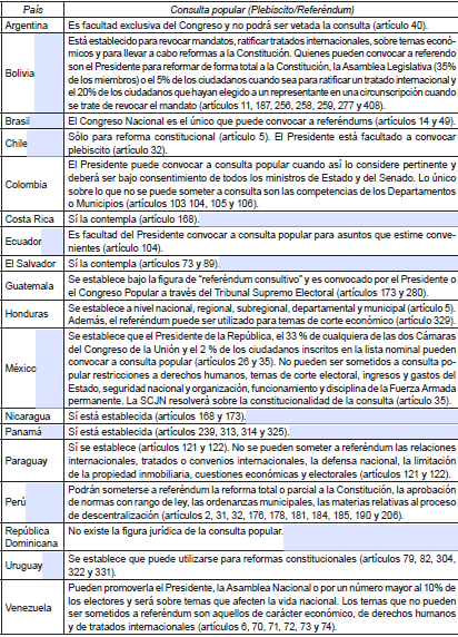 Como lo muestra el Cuadro 3, hasta ahora, República Dominicana es el único país que no ha incorporado en su constitución la figura del plebiscito o referéndum. Los 17 países restantes contemplan la posibilidad de convocatoria a una consulta popular. Las diferencias entre cada país tienen que ver con el actor que convoca (el Ejecutivo federal, algún ejecutivo local, el Poder Legislativo o un partido político), así como los temas que se pueden someter a referéndum y las reglas con las que va a funcionar este ejercicio. Algunas de las constituciones no establecen cuáles son las instituciones que tienen el poder de convocatoria. En países como Chile, Colombia, Ecuador y Guatemala, se establece que el presidente es el único facultado para la convocatoria, ya sea de forma personal o a través de alguna instancia especial, como el caso de Guatemala, en donde lo hace a través del Tribunal Supremo Electoral. En casos como Argentina y Brasil, el órgano al que compete la convocatoria es el Poder Legislativo. Mientras que en Bolivia, Venezuela y México, esta prerrogativa recae en el Ejecutivo, el Legislativo, los partidos políticos, o incluso, en la ciudadanía. En el resto de los países si bien este instrumento está establecido en sus constituciones, no se establece quién es el órgano encargado de la convocatoria. De igual forma, algunos textos constitucionales contemplan restricciones sobre los temas que pueden ser sometidos a consulta popular. Países como Bolivia, Chile, Honduras, Perú y Uruguay, son los únicos que han establecido de manera explícita que las consultas serán sobre reformas políticas, económicas o sobre la misma constitución. A su vez, países como México han incorporado recientemente esta figura en su constitución, restringiendo su uso en temas electorales, de derechos humanos, ingresos y gastos del Estado y seguridad nacional. El único caso que faculta plenamente a un presidente para preguntar sobre cualquier tema es el de Ecuador, teniendo además la prerrogativa de convocar en el momento que lo desee; es decir, no tiene restricciones sobre los tiempos y los temas. Cabe destacar que los presidentes de Bolivia, Colombia, Ecuador, Paraguay y Venezuela, están facultados para convocar a consultas con carácter vinculante. En Bolivia, la única restricción son temas relacionados con asuntos fiscales, la seguridad interna y externa y la división política de la República; la consulta tendrá validez si participa el 50% de la ciudadanía. En Paraguay, el titular del Ejecutivo puede convocar a un referendo ya sea consultivo o vinculante, aunque la convocatoria emitida por el presidente tiene que ser aprobada por el Congreso. En Colombia se pueden someter a consulta políticas del Ejecutivo sin que sea necesaria la aprobación de la Legislatura, la única restricción tiene que ver con los estados de excepción; para el caso de las reformas constitucionales, la consulta exige el voto de más de la mitad de los ciudadanos. En Venezuela, el presidente puede convocar a un referendo consultivo en temas de "especial trascendencia nacional"; de igual forma, pueden ser sometidos a referendo con carácter vinculante "los tratados, convenios o acuerdos internacionales que pudieren comprometer la soberanía nacional o transferir competencias a órganos supranacionales"; también puede someter a referendo vinculante la posibilidad de que el presidente pueda abrogar total o parcialmente algunas leyes. En el caso de la Argentina, si bien el presidente es quien puede convocar a una consulta, no tiene carácter vinculante (Kaufmann, 2008). Si bien la mayoría de las constituciones de la región latinoamericana contemplan la figura del referéndum o la consulta, algunos presidentes han abusado de este mecanismo para legitimar sus decisiones con el apoyo de la mayoría de los ciudadanos; otros mandatarios, en cambio, han recurrido a ella con menor frecuencia, mientras que algunos países han desistido utilizarlas.9 Considerando los datos arrojados hasta ahora por las 18 constituciones latinoamericanas referentes a las facultades presidenciales en materia reglamentaria (poder de veto, poder de emergencia, facultades de decreto, delegación legislativa y poder de convocatoria a consulta popular), a continuación se presenta un índice comparativo que da cuenta de los niveles de concentración de poderes que tienen los presidentes de la región.