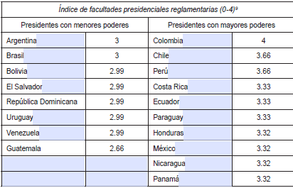 De acuerdo a este índice, se presentan dos variantes. Por un lado, hay presidentes más fuertes que otros en materia reglamentaria, y presidentes con menores facultades que sus contrapartes de la región. La media en este índice es de 3.23, lo que nos permite observar que ocho países se encuentran por debajo, siendo Guatemala el país en donde su Presidente se halla más débil en comparación con los 17 países restantes. La debilidad del Presidente guatemalteco (2.66) radica en la falta de los tres tipos de veto (sólo cuenta con el total), así como de facultades de decreto y de delegación legislativa. A su vez, Venezuela, Uruguay, República Dominicana, El Salvador, Bolivia, Brasil y Argentina, se encuentran en la misma situación que Guatemala, la diferencia radica en que estos países poseen un tipo más de veto y/o facultades de decreto o delegación legislativa. Los diez presidentes más fuertes de la región son: Panamá, Nicaragua, México, Honduras, Paraguay, Ecuador, Costa Rica, Perú, Chile y Colombia; cada uno de ellos excede la media de la región, lo que implica mayores atribuciones en materia reglamentaria. El caso colombiano resulta el más significativo, pues como se mostró en cada uno de los apartados anteriores, su Presidente posee todas y cada una de las atribuciones en materia legislativa, desde presentar iniciativas y vetarlas de las tres diversas formas; además, cuenta con poderes de emergencia, de decreto, delegación legislativa, así como la facultad de convocar a consulta popular. En los demás casos, las diferencias se encuentran en la falta de algún tipo de veto (en Chile y Perú, la diferencia radica en que carecen de veto parcial y de bolsillo, respectivamente), alguna facultad en materia de decreto, delegación legislativa o de poderes de emergencia; sin embargo, no se encuentran tan carentes de ellas como el primer grupo de países. Esto no implica que los presidentes de la región que se han catalogado como más fuertes, en realidad lo sean en la práctica política. Sin embargo, lo que sí se puede observar es que se trata de mandatarios con mayores atribuciones. Para determinar cuáles presidentes son más fuertes y cuáles más débiles, es necesario analizar otro tipo de variables y así reconocer de mejor manera las variantes de los sistemas presidencialistas en la región. Para ello se ha considerado la desconcentración de facultades del Ejecutivo, ya sea hacia alguno de los otros poderes federales, o bien hacia los órganos constitucionales autónomos.
