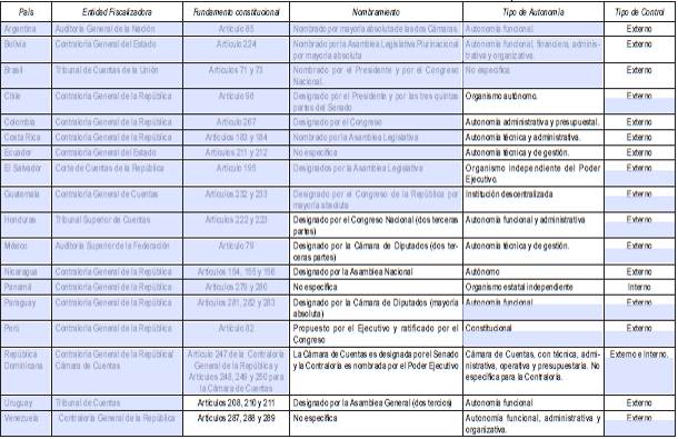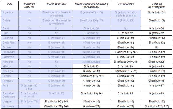 Este autor considera que la mayoría de los países latinoamericanos se encuentran en la fase transicional. El Cuadro 5 muestra los diferentes mecanismos de control que ejerce el Poder Legislativo hacia las acciones del Ejecutivo en los diferentes países latinoamericanos. A su vez, los cuadros 6, 7, 8, y 9 dan cuenta de los casos en donde se han establecido (o hay ausencia) órganos de transparencia y acceso a la información, de protección de derechos humanos, de entidades fiscalizadoras de recursos públicos, así como aquellas que han otorgado autonomía a sus instancias de procuración de justicia. Cabe aclarar que aunque se trata de postulados establecidos en algunas constituciones de la región, ello no necesariamente implica que en la práctica estos órganos autónomos cumplan con los objetivos para los que fueron concebidos ni que sean plenamente eficaces u operen con plena autonomía de funciones.
