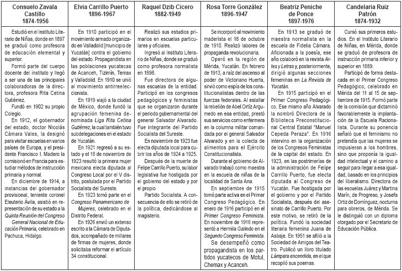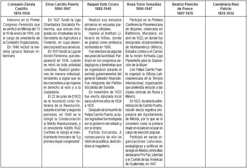 Es decir, las mujeres del Primer Congreso Feminista de Yucatán, a pesar de no contar con el reconocimiento constitucional como ciudadanas, también son y se comportan como sujetos políticos; sin duda, son actoras autónomas reales que desean y pueden hacerse responsables de los asuntos del Estado. No sólo impulsadas por un efusividad o carácter, expresamente este grupo de mujeres también cuenta con elementos formativos que favorecen su impulso, o han desarrollado alguna carrera, o bien ya habían tenido encomiendas dentro de los espacios públicos. Así, tenemos en su mayoría profesoras de educación primaria, directoras de escuela e incluso enfermeras. Lo interesante en cada uno de los casos es que en el trayecto de su vida activa y laboral se hace presente como detonante la insumisión, que logran canalizar a través de su arriesgada pero satisfactoria incorporación a grupos políticos importantes asociados al antirreeleccionismo o a partidos políticos, como lo fue el Partido Socialista del Sureste, y de ahí extender sus alcances como mujeres en lo individual y en lo colectivo, hacia otros espacios de mayor presencia y envergadura.