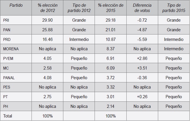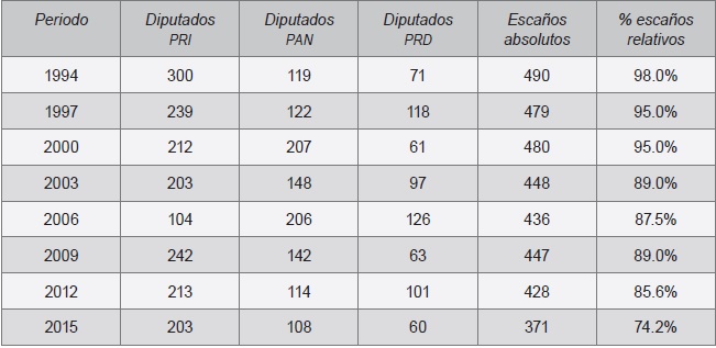 Las tres elecciones intermedias consecutivas de 1997, 2003 y 2009, se caracterizaron por el castigo al partido del Presidente, pero 2015 ofreció un resultado atípico que modificó esa tendencia: las curules ganadas por el PRI interrumpieron tres procesos intermedios consecutivos en los cuales los votantes castigaron fuertemente al partido del Presidente, lo cual, sin embargo, no impidió una nueva configuración del sistema de partidos.