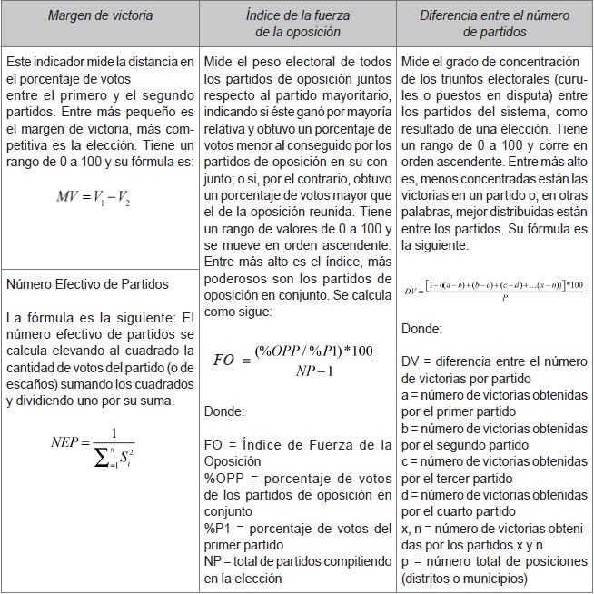 El índice del grado de concentración de triunfos en los distritos electorales (dv), con una escala que va de 0 a 100, integra los triunfos de un solo partido: entre más alto, más concentradas están las victorias en un solo partido. El resultado fue de 48.33 puntos: el PRI requiere de muy poco apoyo para lograr la mayoría absoluta (50+1%). La combinación del margen de victoria (mv) con la fuerza de la oposición (fo) y la distribución de votos (dv), arroja un Índice Compuesto de Competitividad (icc) de 55.10 puntos, lo cual ubica al sistema de partidos en un nivel medio, ya que los escaños se concentraron esencialmente en dos partidos, PRI y PAN.
