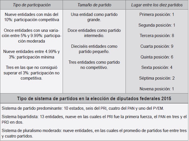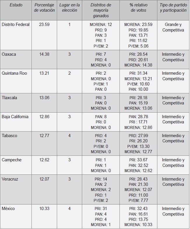 La Ciudad de México fue el principal bastión de MORENA y el PRD quedó como la segunda fuerza. En esta entidad, los dos partidos prácticamente se dividieron las preferencias. En la elección de 2012, el PRD había obtenido el 31.62%, mientras en 2015 alcanzó el 19.85%, una reducción de 11.87% de las preferencias. De los 27 distritos, MORENA ganó 12, el PRD nueve, el PAN tres, el pvem dos y el PRI uno. En Quintana Roo, MORENA quedó en segundo lugar con el 13.21%, aunque no le alcanzó para ganar en ninguno de los tres distritos, ubicándose detrás del PRI, que obtuvo el 31.34%. En ese estado, MORENA desplazó al PAN y al PRD. En Tlaxcala, Baja California, Campeche y Veracruz, MORENA se colocó en el tercer lugar, desplazando al PRD, aunque tampoco logró obtener distrito alguno. En Tabasco y el Estado de México logró los votos necesarios para colocarse en el cuarto lugar, detrás de PRI, PAN y PRD. El balance en general de MORENA en estos nueve estados es de un partido competitivo, a pesar de ser de reciente creación (el pvem logró ubicarse dentro de los primeros cuatro lugares en el estado de Tabasco). MORENA aparece como partido grande y competitivo sólo en una entidad, mientras en ocho estados se ubica como partido intermedio, pero competitivo. Con base en la distribución de los Distritos, dos estados se ubican en un sistema de partido predominante: Tlaxcala (PRI) y Baja California (PAN); cuatro con características bipartidistas como Oaxaca (PRI/PRD), Quintana Roo (PRI/ pvem), Tabasco (PRD/PRI) y Campeche (PRI/PAN). Tres estados presentan una distribución de los distritos en tres o más partidos, correspondiente al pluralismo moderado: cdmx (MORENA/PRD/PAN), Veracruz (PRI/PRD/PAN/MORENA) y Estado de México (PRI/PAN/PRD/MORENA).