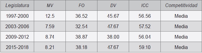 El Índice Compuesto de Competitividad (icc) sirve para evaluar la elección en su conjunto (Méndez, 2003: 147),12 con los datos de los 300 distritos de mayoría, a partir de cuatro categorías: no competitivo, baja competitividad, competitividad media y alta competitividad. Para realizarlo, se utiliza el margen de victoria (mv), el índice de fuerza de la oposición (fo) y la diferencia entre el número de victorias por partido (dv), todos en un rango de 0 a 100 (Anexo 3). Se observará que el grado de competitividad de las elecciones de 2015 se ubicó en un nivel medio, igual que en las de 1997, 2003 y 2009.