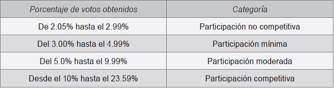 Una vez calculadas por separado las variables del icc, se aplica la fórmula y el resultado se interpreta a partir de las cuatro categorías que miden el grado de competitividad de la elección en su conjunto: No competitivo: de 0 a 25.99%; Baja competitividad: de 26.00 a 50.99%; Competitividad media: de 51.00 a 75.99%, y Alta competitividad: de 76.00 a 100%. El resultado del icc es de 59.10 puntos. La elección de junio de 2015 para la renovación de los 300 escaños en la Cámara de Diputados se ubicó en un nivel medio de competitividad, debido a la fuerza del PRI y del PAN, partidos que concentraron más del 71% de los distritos. Un dato significativo es que los partidos de izquierda suman 58 escaños de los 300, un destacado 19.33% del total, con la desventaja de la fragmentación de la izquierda en varios partidos, lo cual acaba debilitándola.