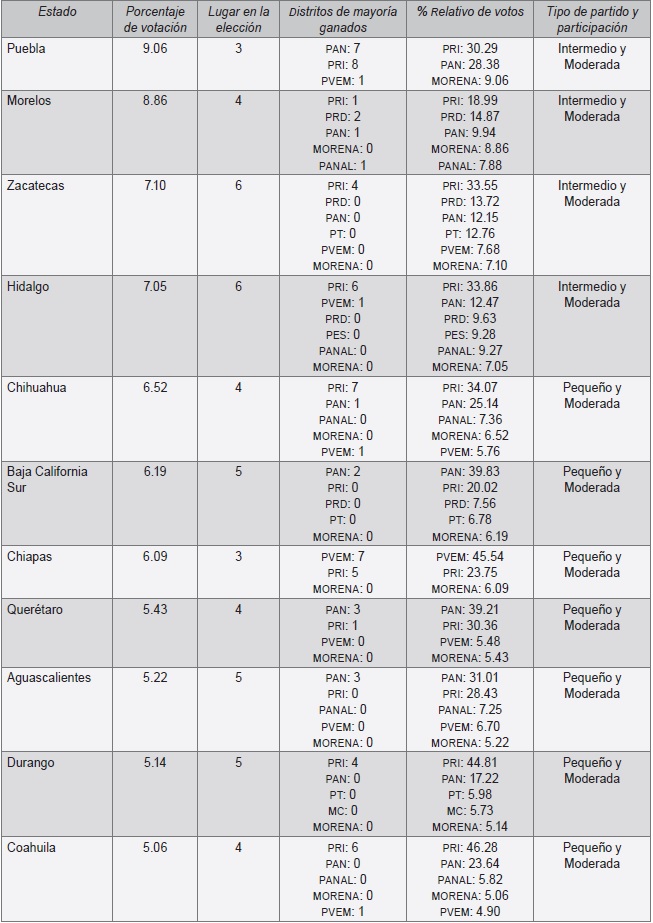 En Chihuahua, Baja California Sur, Chiapas, Querétaro, Aguascalientes, Durango y Coahuila, su votación osciló entre el 6.52 y el 5.0%, que está por debajo de su promedio nacional. En ellos, MORENA se ubicó en la categoría de partido pequeño con una participación moderada. De esos, el PRI ocupó el primer lugar en siete estados, el PAN en tres y el pvem en uno. La posición más relevante de MORENA fue el tercer lugar en Puebla y Chiapas. De ahí, fue cuarta posición en Morelos, Chihuahua, Querétaro y Coahuila, y quinto lugar en Hidalgo, Baja California Sur, Aguascalientes y Durango. Finalmente, quedó en sexto lugar en Zacatecas. La constante fue que en estos 11 estados no ganó ningún distrito.