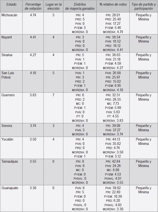 En este grupo se encuentran nueve entidades en las que la votación de MORENA osciló entre el 4.99 y el 3.00%, situándolo como partido pequeño con una participación mínima. Los votos van desde el 4.74% en Michoacán hasta el 3.30% en Guanajuato. En estos estados la tarea fue complicada, pues compitió con partidos grandes e intermedios, además de los partidos pequeños mejor posicionados. Ocupó el tercer lugar en Sonora; cuarta posición en Nayarit, Sinaloa y Yucatán; quinto lugar en San Luis Potosí y Michoacán, y sexto en los estados de Guerrero, Tamaulipas y Guanajuato (Cuadro 5).