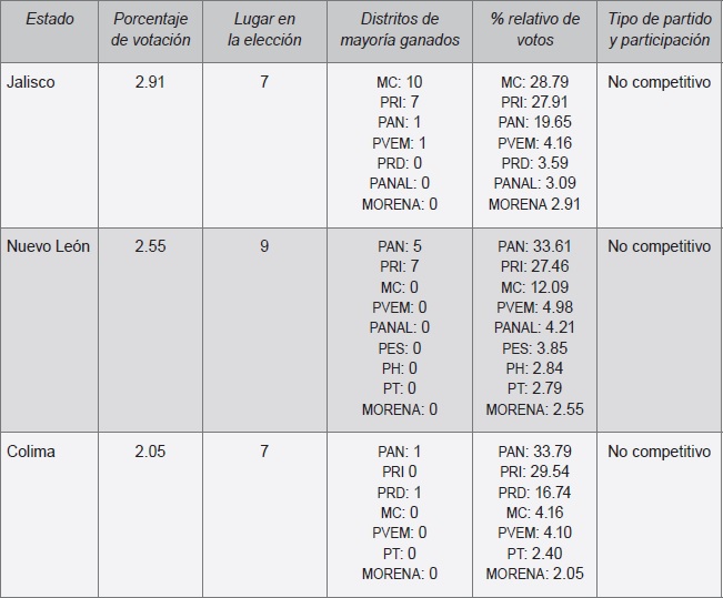 En Jalisco, Nuevo León y Colima, MORENA no superó el 3% de los votos, quedando en la séptima posición en Jalisco y Colima y en la novena en Nuevo León. De manera inusual, en Jalisco el primer lugar se lo llevó mc con el 28.79% (Cuadro 6).