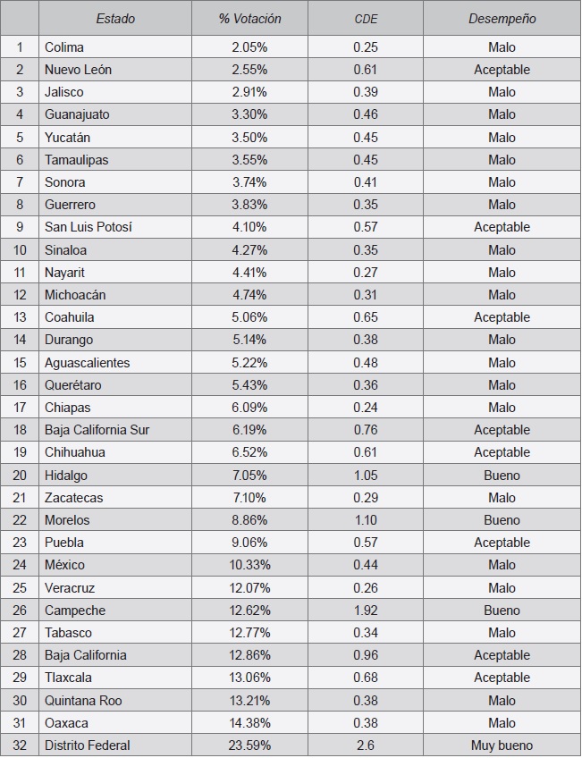Valdés señala que el desempeño diferenciado se puede cuantificar a partir de un indicador de proporciones: el cde trata de relacionar la proporción de votos obtenida por cada partido en los estados con su proporción de votos a nivel nacional. Dicho de otra manera, es una medición de la presencia electoral del partido, independientemente del lugar que alcanzó en una entidad por el porcentaje de votos: el partido compite contra sí mismo en términos de su implantación electoral en cada uno de los estados e indica dónde tuvo mayor o menor impacto electoral.