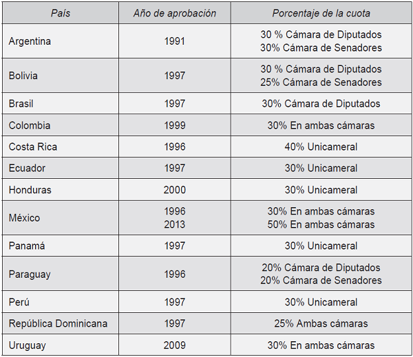 Argentina fue el primer país en la región que aplicó la cuota de género con un porcentaje de 30% para cada cámara legislativa. Posteriormente, lo hicieron Costa Rica, México y Paraguay, en 1996; Bolivia, Brasil, Colombia, Ecuador, Panamá, Perú y República Dominicana adoptaron esta medida en 1997. Honduras fue el penúltimo en acoger las cuotas de género en el año 2000, mientras que Uruguay lo hizo recientemente en las elecciones de 2015.