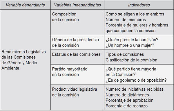 Por lo anterior, aquí se compara a las comisiones de género con otras comisiones temáticas similares que surgieron en esa misma época y que impulsan una agenda específica. En el Cuadro 2 se muestran las variables e indicadores para identificar algunos de los factores institucionales que inciden en que una comisión temática –en este caso la de Estudios de Género o Medio Ambiente– tenga una mayor relevancia o centralidad en el proceso legislativo.