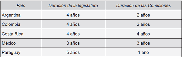 En el Cuadro 3 se reporta los periodos de duración de cada legislatura y de las comisiones en los países estudiados, con el fin de distinguir aquellos países donde los periodos son mayores como Paraguay, Argentina, Colombia y Costa Rica, de aquel periodo más corto como se da en el caso de México. Por otro lado, conviene tener en cuenta que los periodos de duración de las comisiones varían de país a país, como ocurre en Paraguay, en donde éstos son de un año hasta los cuatro que se presentan en Costa Rica. Este dato es muy importante debido a que además de las bajas tasas de reelección que suelen presentarse en los países latinoamericanos (México y Costa Rica no tienen reelección inmediata) y en los que sí existe la reelección, la duración de la comisión es menor a la de la propia legislatura, lo que representa un serio obstáculo para la institucionalización de las comisiones temáticas (sea en género, medio ambiente o cualquier otro tema relevante).