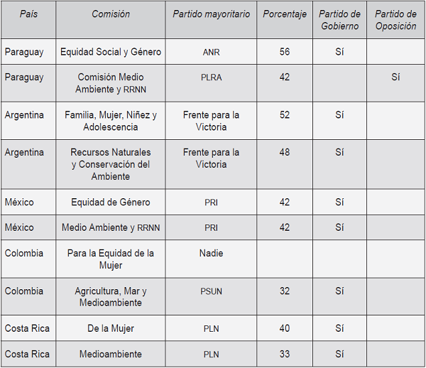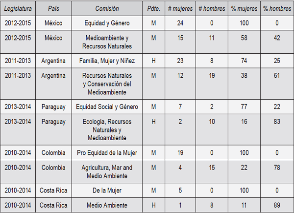 Respecto a las presidencias de las comisiones, en México, Paraguay, Colombia y Costa Rica, todas las de Género están presididas por mujeres; no así en el caso argentino, donde un diputado preside la Comisión de Familia, Mujer y Niñez. Las Comisiones de Medio Ambiente en México, Recursos Naturales en Argentina y de Agro, Mar y Ambiente de Colombia son presididas por mujeres; por su parte, la de Ecología de Paraguay Medio Ambiente de Costa Rica son presididas por varones como de detalla en el Cuadro 4.