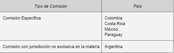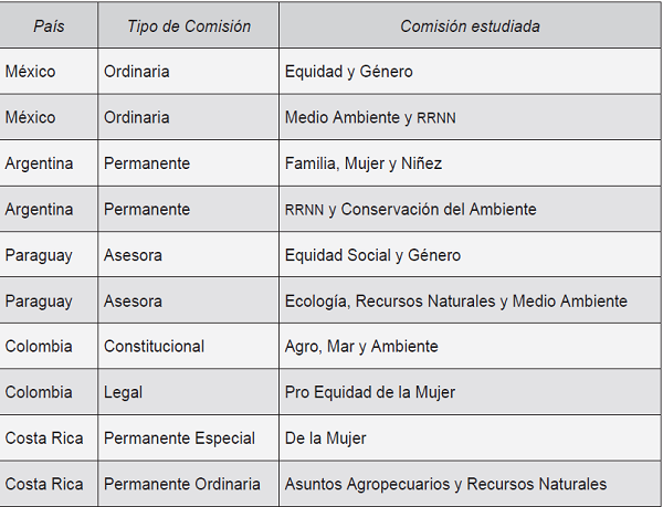 Mientras que en México, Argentina y Paraguay, las Comisiones tienen carácter ordinario, permanente o asesor, respectivamente, en los otros casos como Colombia y Costa Rica son de tipo legal o especial. Aquí llama la atención las diferencias entre las comisiones estudiadas en Colombia y Costa Rica, ya que en ambos países las de Pro Equidad de la Mujer y De la Mujer tienen un rango menor que sus pares de Agro, Mar y Ambiente o Asuntos Agropecuarios y Recursos Naturales.