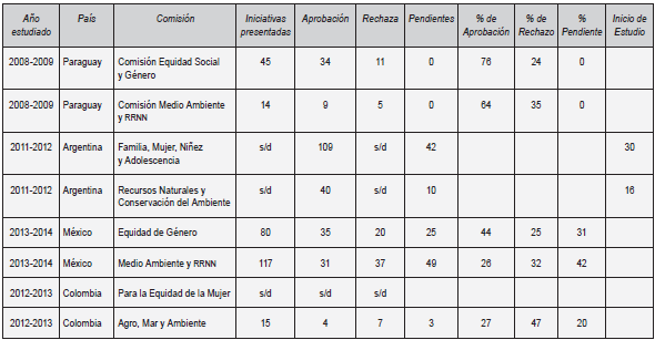 En esta investigación, la actividad legislativa de las comisiones se refiere al desempeño que tienen de acuerdo a la cantidad de iniciativas presentadas para su estudio, el número de iniciativas aprobadas, el número de rechazadas, el número de pendientes y el porcentaje de aprobadas, rechazadas o pendientes. Cabe señalar que no ha sido posible obtener toda la información sobre la actividad legislativa de las comisiones en virtud de los bajos niveles de accesibilidad y transparencia legislativa en América Latina, por ello en el cuadro 8 se señala con s/d (sin datos) todos aquellos casos en los que no se obtuvo la información por no encontrarse disponible.