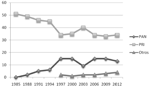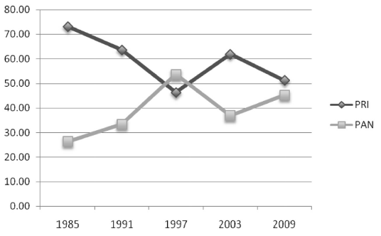 Los procesos electorales han resultado muy competitivos desde los años setenta. Los principales actores han sido el PRI y el PAN, llegando a desatarse importantes conflictos post-electorales ante la existencia de fraudes que favorecieron al PRI en 1985 y 1994. En las elecciones de gobernador, a partir de 1985 comenzaría un declive en el porcentaje de votación recibida por el PRI, frente a un crecimiento del PAN, tal como se expone en la siguiente gráfica. Sería hasta 1997 cuando se presentaría la primera alternancia en el gobierno del estado con la victoria del PAN; aunque seis años después, el PRI recuperaría el gobierno del estado. Eso demostró su capacidad de recuperación y la incapacidad del PAN para consolidar un realineamiento electoral.