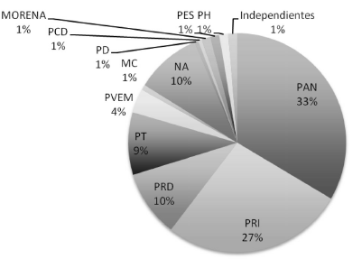 En segundo lugar, al no contar con un grupo parlamentario, las relaciones con el Legislativo crean condiciones no estudiadas por la Ciencia Política. Los supuestos clásicos señalan que en un sistema presidencial, la oposición busca el fracaso del Ejecutivo con miras a la siguiente elección. Pero ya que el Ejecutivo no cuenta con partido político, tampoco tiene oposición, ya que no es visto como competencia futura por los partidos en el Legislativo y hace posible la negociación, lo cual se trastoca cuando el gobernador expresa sus intenciones de competir por la Presidencia de la República en el 2018. Los diputados más cercanos en términos ideológicos son los de MC, pero incluso ellos señalan que no están sometidos a la voluntad del gobernador; por otro lado, tampoco hay claridad en quién es la oposición del gobierno, ya que si bien en términos discursivos el mayor enfrentamiento durante el proceso electoral se generó entre el candidato independiente y el PRI, el partido que interpuso la mayor cantidad de recursos para sancionar actos políticos e incluso tratar de invalidar el resultado de la elección fue el PAN; por ello se puede considerar a este partido como oposición real.