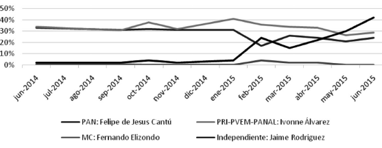 A partir del primer debate, las figuras de Jaime Rodríguez y Fernando Elizondo se fortalecieron, al tiempo que la candidata del PRI, sin entrar en enfrentamientos directos con sus contrincantes, mantenía una intención del voto a la baja en las encuestas. Por su parte, Felipe de Jesús Cantú, no lograba mejorar su posición. A partir de entonces, estas tendencias no se revertirían, tal como se expresa en la siguiente gráfica: