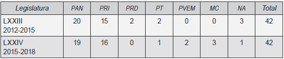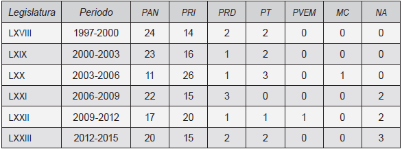 La integración del Congreso del estado ha generado una tradición de pluralidad. Su integración ha divido el poder y ha reducido la capacidad de los gobernadores para decidir unilateralmente, tal como se expone en el siguiente cuadro: