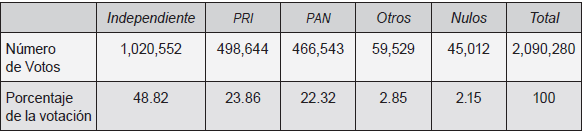 Lo anterior evidencia que a pesar factores como la iniquidad para ser registrado como candidato; de la amplia diferencia en el financiamiento público, el acceso a medios de comunicación y el trato de éstos hacia los candidatos, el uso de las redes sociales como plataforma de campaña, con un discurso populista e irreverente, un candidato independiente ganó la elección de gobernador. No obstante, ello no significa el derrumbe del sistema de partidos, ya que tanto en el Congreso, como en la mayoría de municipios, siguen gobernando los partidos políticos “tradicionales”, especialmente el PRI y el PAN.