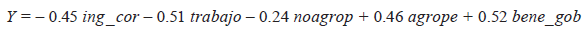 En el Cuadro 2 se observa que el nivel de ingreso corriente (ing_cor) tiene una correlación positiva muy alta con la proporción del ingreso que proviene de trabajo asalariado (trabajo); y en contraste, la correlación es muy alta pero negativa con la proporción del ingreso que proviene de beneficios por programas gubernamentales (bene_ gob); la correlación también es negativa y considerablemente alta con el rubro de ingresos por negocios agropecuarios (agrope).
