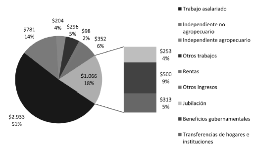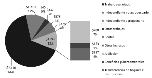 Se observa que la diferencia principal en la composición del ingreso corriente cuando se comparan localidades urbanas con rurales, es que resulta notablemente menor el rubro de trabajo asalariado (36%) en las rurales, y sólo en este ámbito es representativa la participación del trabajo independiente agropecuario (6%).