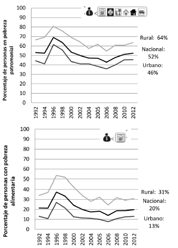 Tomando como referencia el costo de la canasta básica alimentaria, se observa que durante los últimos 20 años, es el 31% de la población rural y 13% de la población urbana son las que disponen de ingresos inferiores al costo de dicha canasta, presentando así pobreza alimentaria (Figura 2).