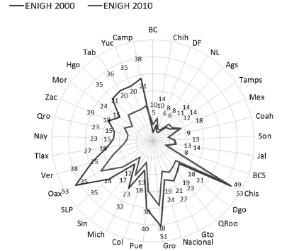 Si se realiza un comparativo entre los resultados de 2000 y 2010 por entidad federativa, se observa que a nivel nacional, la pobreza alimentaria bajó del 24% al 19% de la población. Esto, debido a que en 25 de las 32 entidades federativas se tuvo un descenso de pobreza alimentaria en el periodo analizado; en particular, los estados de Tabasco, Yucatán y Campeche, reflejaron una disminución de personas con pobreza alimentaria de más del 40% (Figura 2).