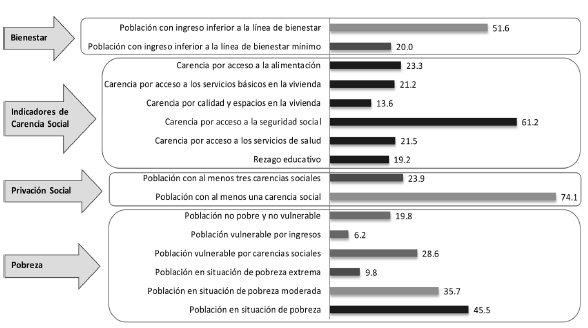 Los derechos sociales que se consideran en la medición de pobreza multidimensional en México son seis: educación, salud, alimentación, calidad y espacios de la vivienda, servicios básicos de la vivienda y seguridad social. Combinando ambas dimensiones, ingresos y derechos sociales, la pobreza multidimensional en México afecta al 45.5% de la población, entre la cual el 9.8% vive en pobreza extrema (CONEVAL , 2012).