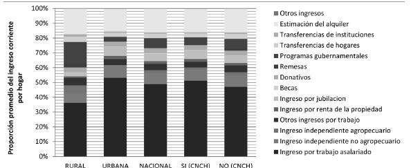 En contraste, cuando se observa por separado a los hogares que se ubican en los municipios que forman parte de la población objetivo de la CNCH, las diferencias en la composición del ingreso de los hogares no son tan evidentes; de hecho, es prácticamente igual al promedio nacional, lo que se explica por la heterogeneidad implícita en la población objetivo definida por esta estrategia.